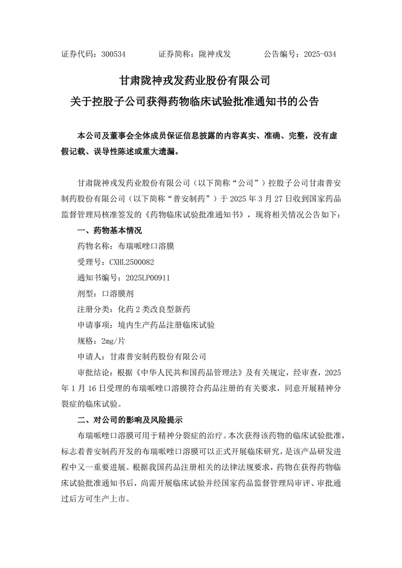 關(guān)于控股子公司獲得藥物臨床試驗(yàn)批準(zhǔn)通知書的公告