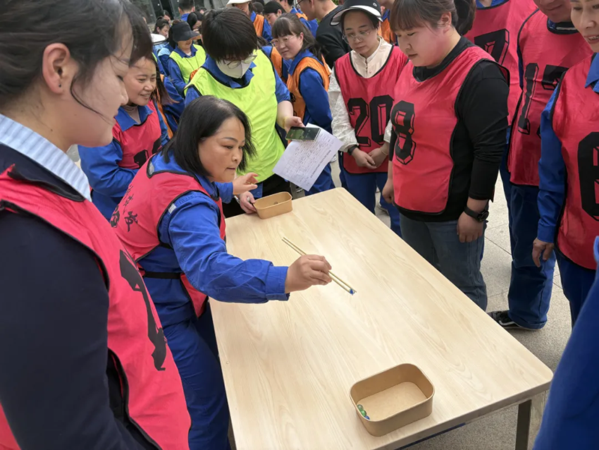 “夾珠大作戰(zhàn)” 看似簡單,實(shí)則需要極強(qiáng)的專注力和手部控制力。選手們手持筷子,小心翼翼地將珠子從一個容器夾到另一個容器。有的職工動作嫻熟,快速完成任務(wù);有的則略顯緊張,珠子幾次掉落,但依然不氣餒,堅持完成比賽。
