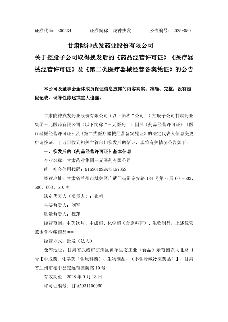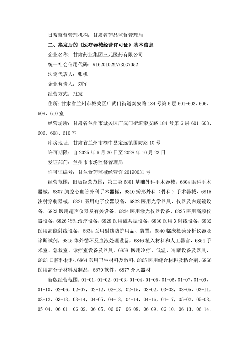 關(guān)于控股子公司取得換發(fā)后的《藥品經(jīng)營許可證》《醫(yī)療器械經(jīng)營許可證》及《第二類醫(yī)療器械經(jīng)營備案憑證》的公告