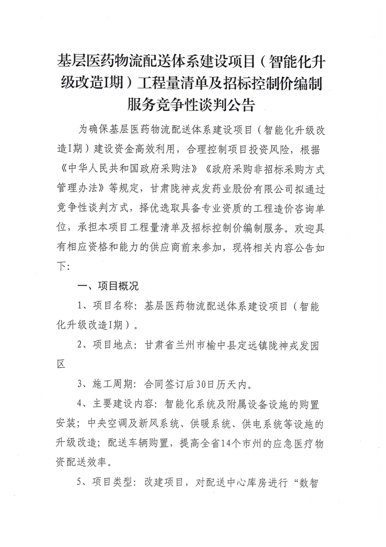 甘肅隴神戎發(fā)藥業(yè)股份有限公司基層醫(yī)藥物流配送體系建設(shè)項目(智能化升級改造I期)工程量清單及招標控制價編制服務(wù)競爭性談判公告