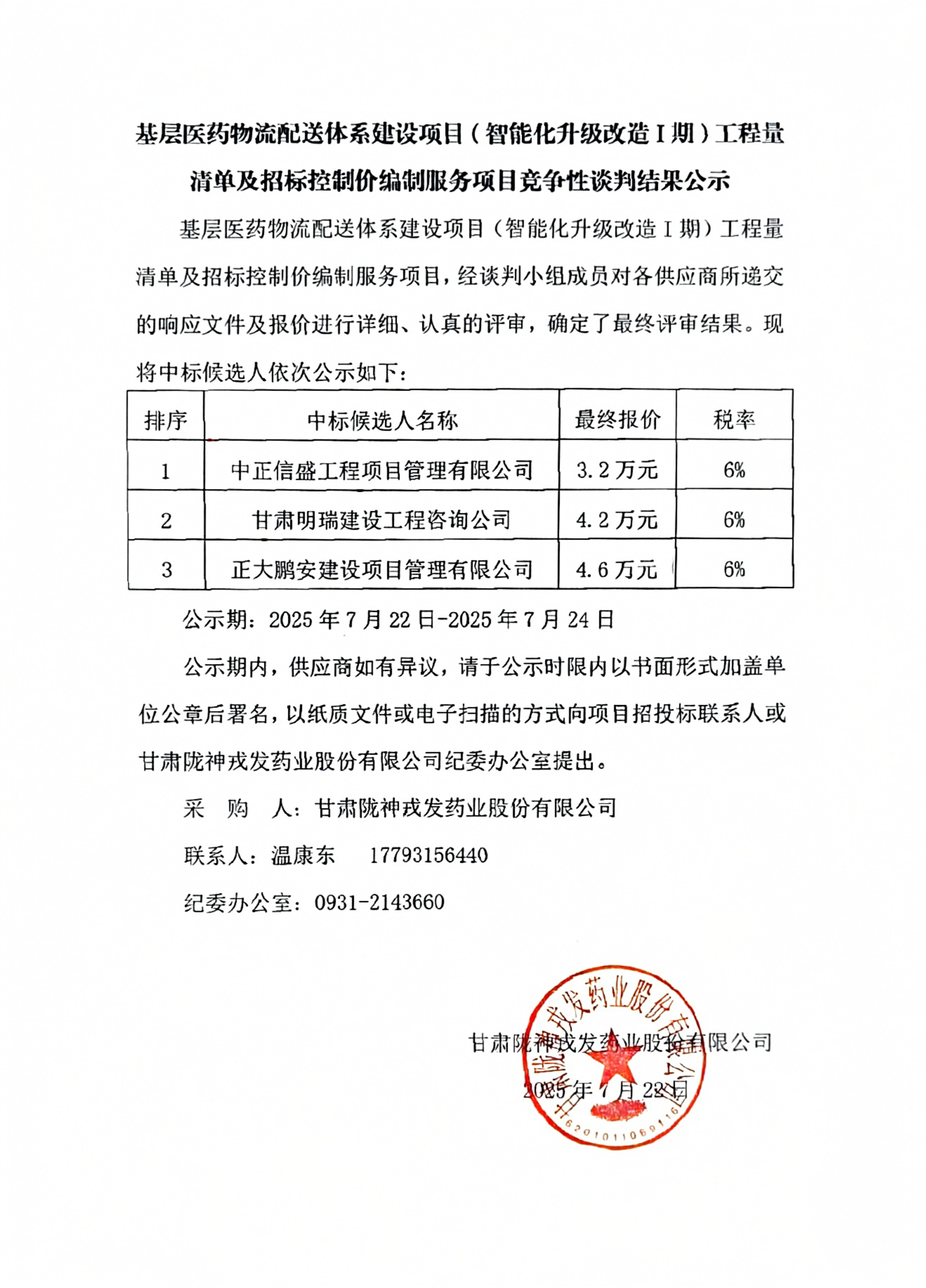 基層醫(yī)藥物流配送體系建設(shè)項目(智能化升級改造I期)工程量清單及招標控制價編制服務(wù)項目競爭性談判結(jié)果公示