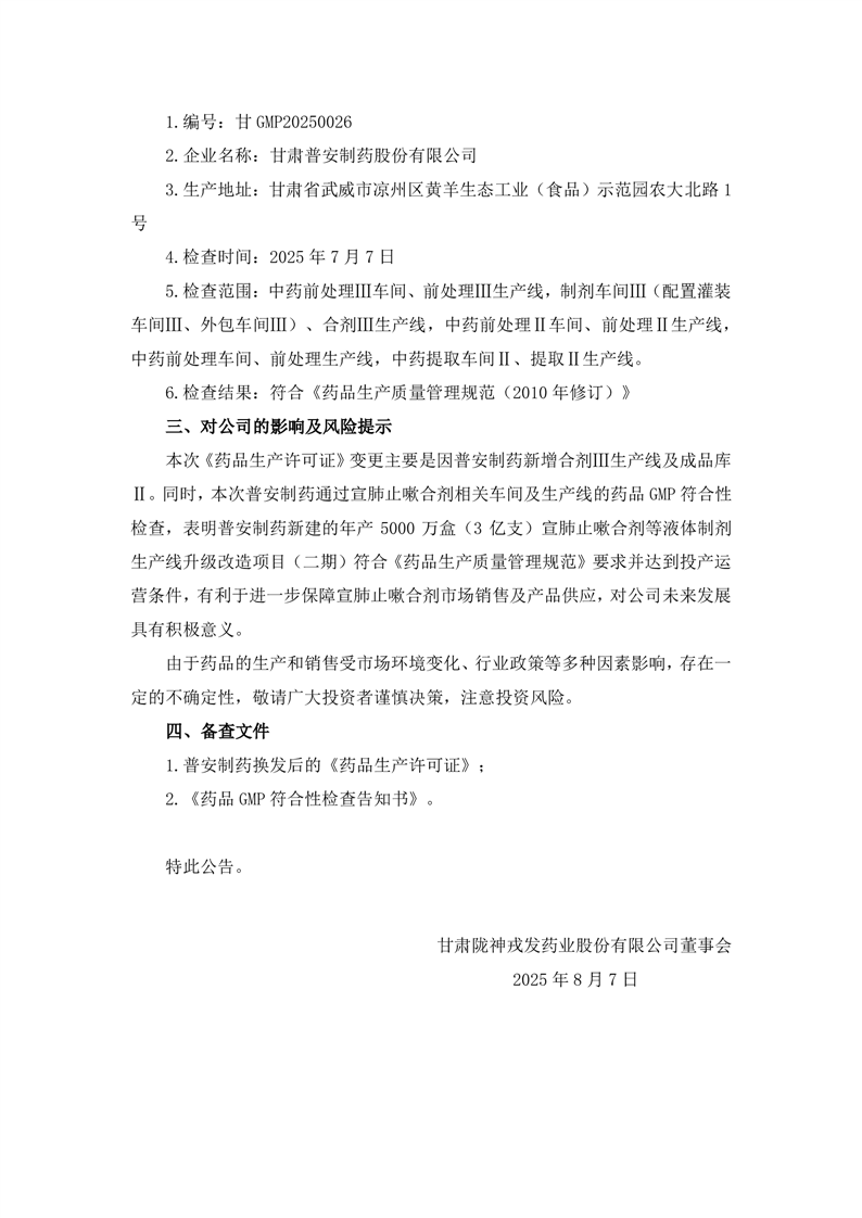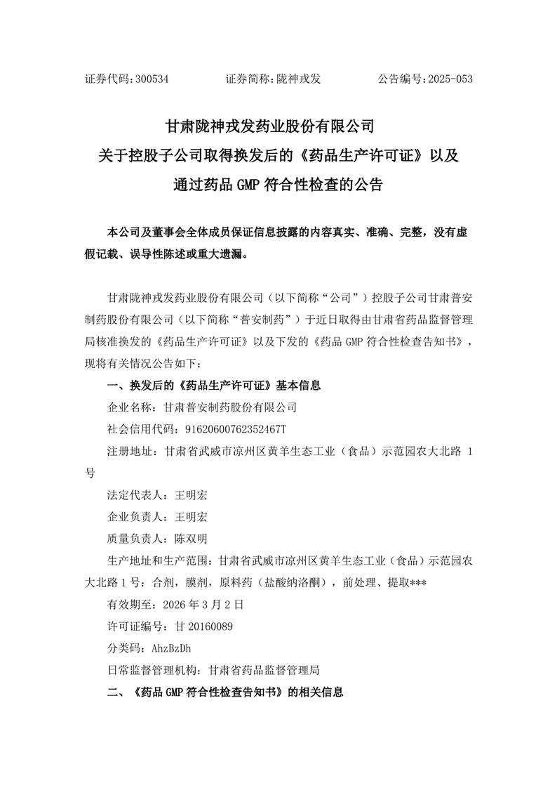 關(guān)于控股子公司取得換發(fā)后的《藥品生產(chǎn)許可證》以及通過藥品GMP符合性檢查的公告