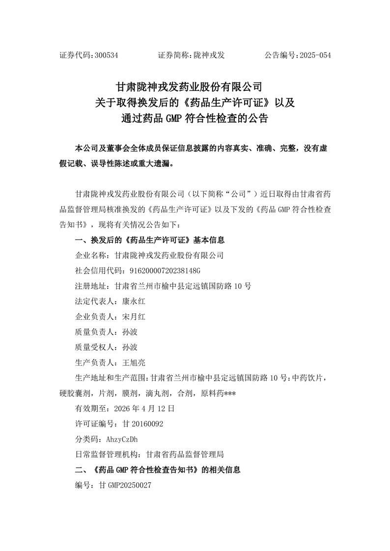 關(guān)于取得換發(fā)后的《藥品生產(chǎn)許可證》以及通過(guò)藥品GMP符合性檢查的公告