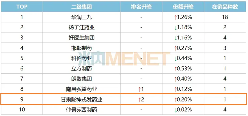 同時,在2025年Q1中成藥胃藥(胃炎、潰瘍)二級集團中,甘肅隴神戎發(fā)藥業(yè)排名上升2位至TOP9、銷售額增長了8.95%。